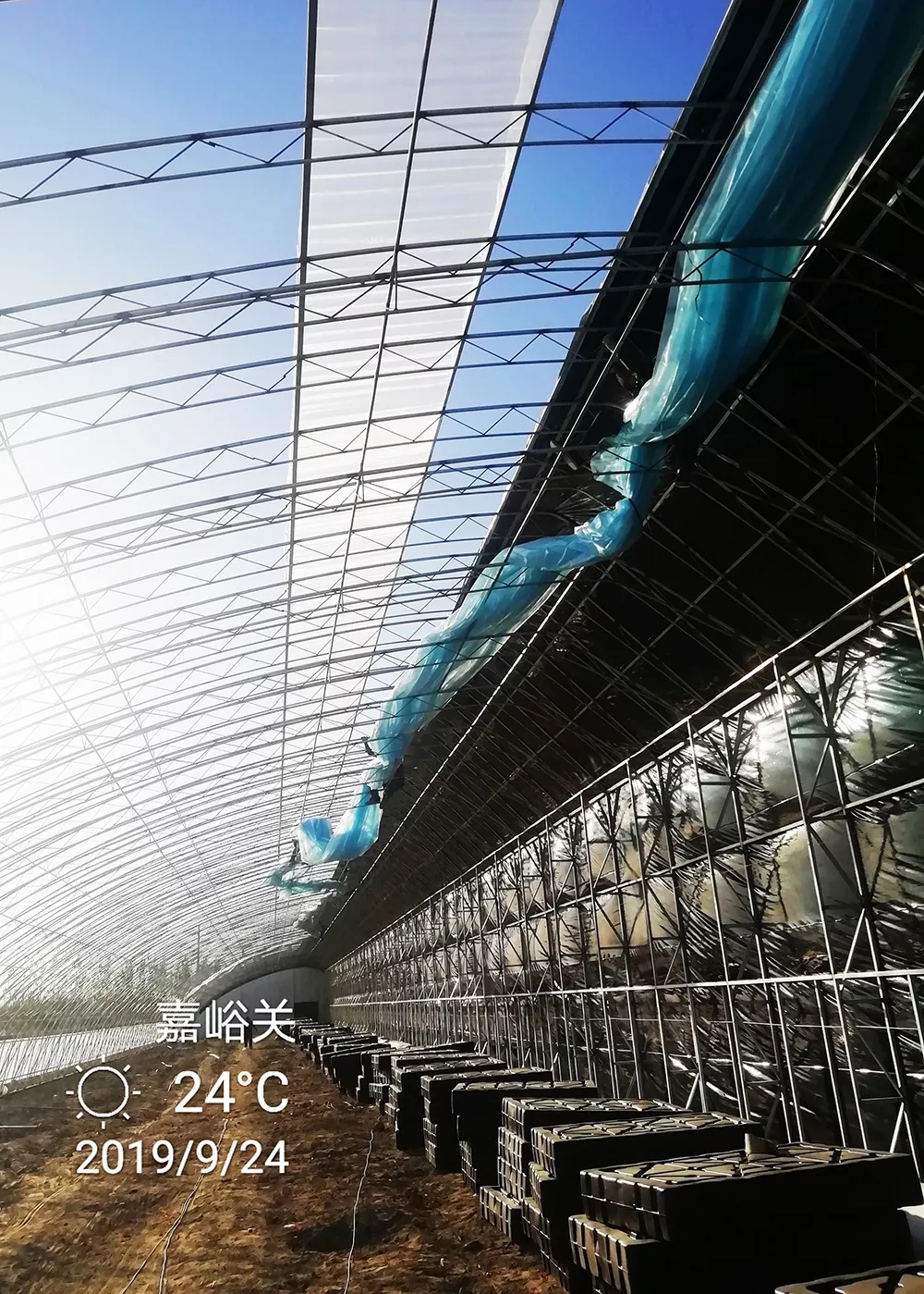 為深入實施鄉村振興戰略,促進農民持續增收以及全力推進嘉峪關設施農業發展進程,2019年,嘉峪關市政府引進內蒙古農業大學與內蒙古中天科技有限公司聯合研發的“水蓄熱雙膜內保溫裝配式日光溫室”新技術,在嘉峪關市城關鎮新城村建設4棟高標準水蓄熱雙膜內保溫裝配式日光溫室,占地面積約20畝,建筑面積約為10畝(溫室規格:長度為135米,跨度為12米,脊高6.1米)。