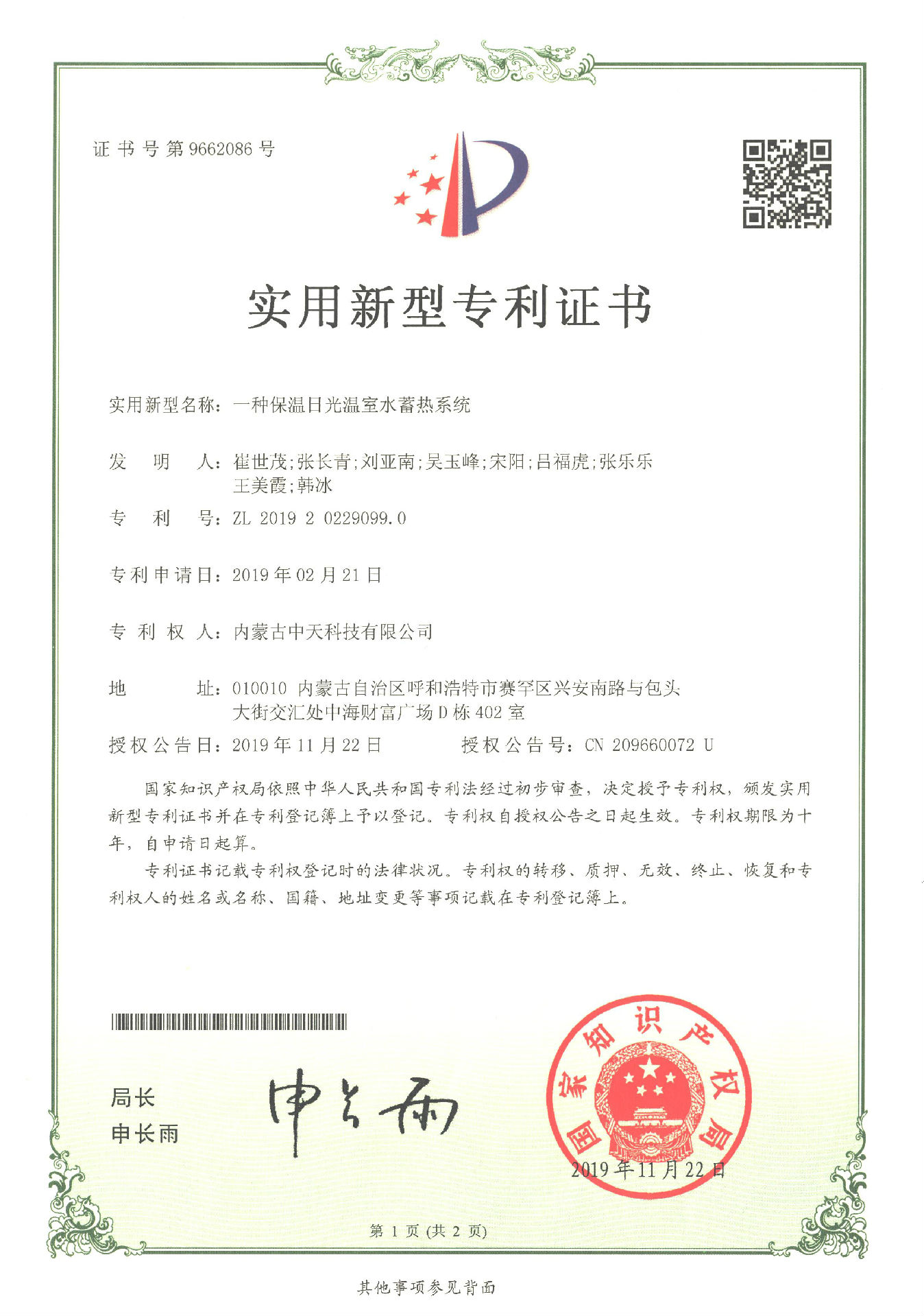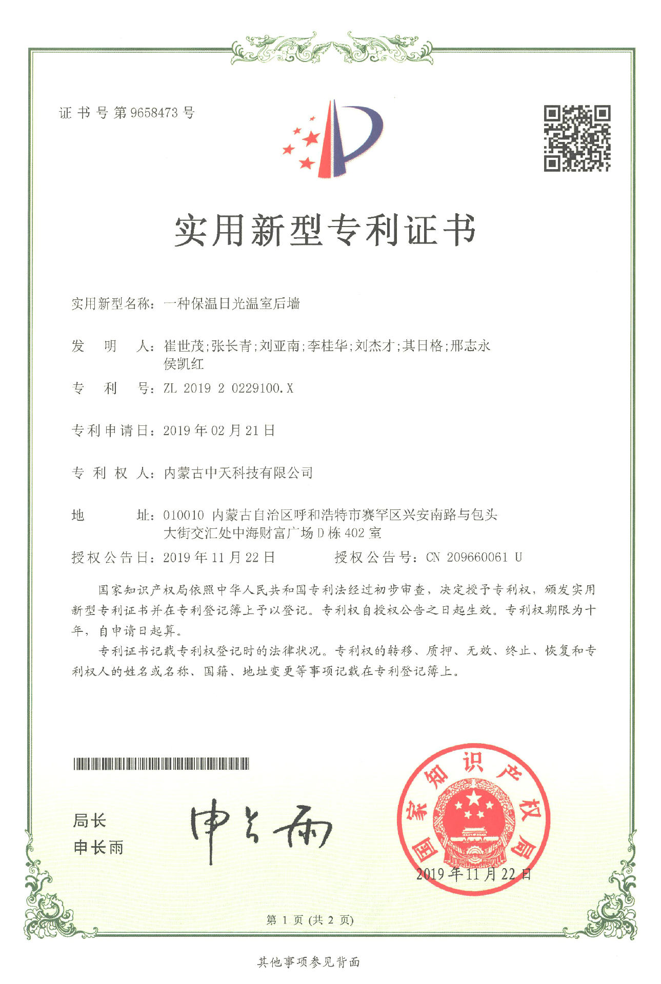 2019年11月22日,公司經過長期對日光溫室的研究、實驗、改進終于又獲得了2項實用新型專利證書,分別是一種保溫日光溫室后墻和一種保溫日光溫室水蓄熱系統。一種保溫日光溫室后墻是采用全鋼骨架,具有結構輕便、采光角度科學合理和承載力強等特點,一種保溫日光溫室水蓄熱系統是由蓄熱水箱組成,具有保溫性能好、蓄放熱量大等特點。